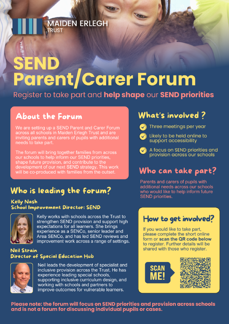 The forum will be led by Kelly Nash, School Improvement Director: SEND, and Neil Strain, Director of Special Education Hub, who work across our schools to strengthen SEND provision and inclusive practice.